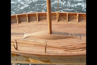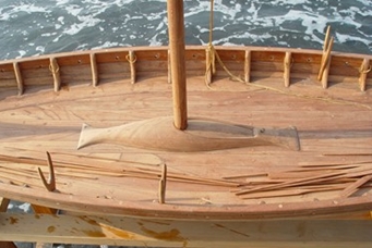 維京戰船的桅杆座相當方便實用,上方有個可拉開的卡榫,拉開後固定桅杆的凹座即可活動,就可將桅杆安裝或卸下. 維京戰船舵的造法也是和一般的船不一樣,上方是利用繩子固定,方便鬆開可供舵上昇或下降,中間則安裝上一個滑輪,可供舵手轉動控制方向,這些維京智慧,都在模型船上忠實的重現.出土的維京船奧塞伯格號( Oseberg ) ,高昂的船首刻有交纏的動物圖騰,顯示當時的維京人已具有高度的工藝水準,圖騰邊從船尾至船身並沒有順勢收尾,到尾部硬生生截止,而模型船就將其圓順的收尾,讓造型更加完整.