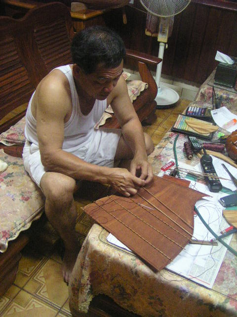 以木材製作的模型比用竹子為材料能保存得更久,然而,用檜木製作出竹子的形狀和彎度,比之用真正的竹子做的竹筏難度要高,由此可知作者在造船上的功力,已經不限船隻的形式種類。 竹筏的製作,首先要將削好的木條以蒸氣加熱,再用C型夾使其彎曲,彎曲好的"竹 子"排好,用C型夾固定住每個木條的彎度,才不會造成參差不齊的情形.固定住當底板的直木條後,再將一條條固定底板用的C型夾固定,使其彎曲緊貼底板。