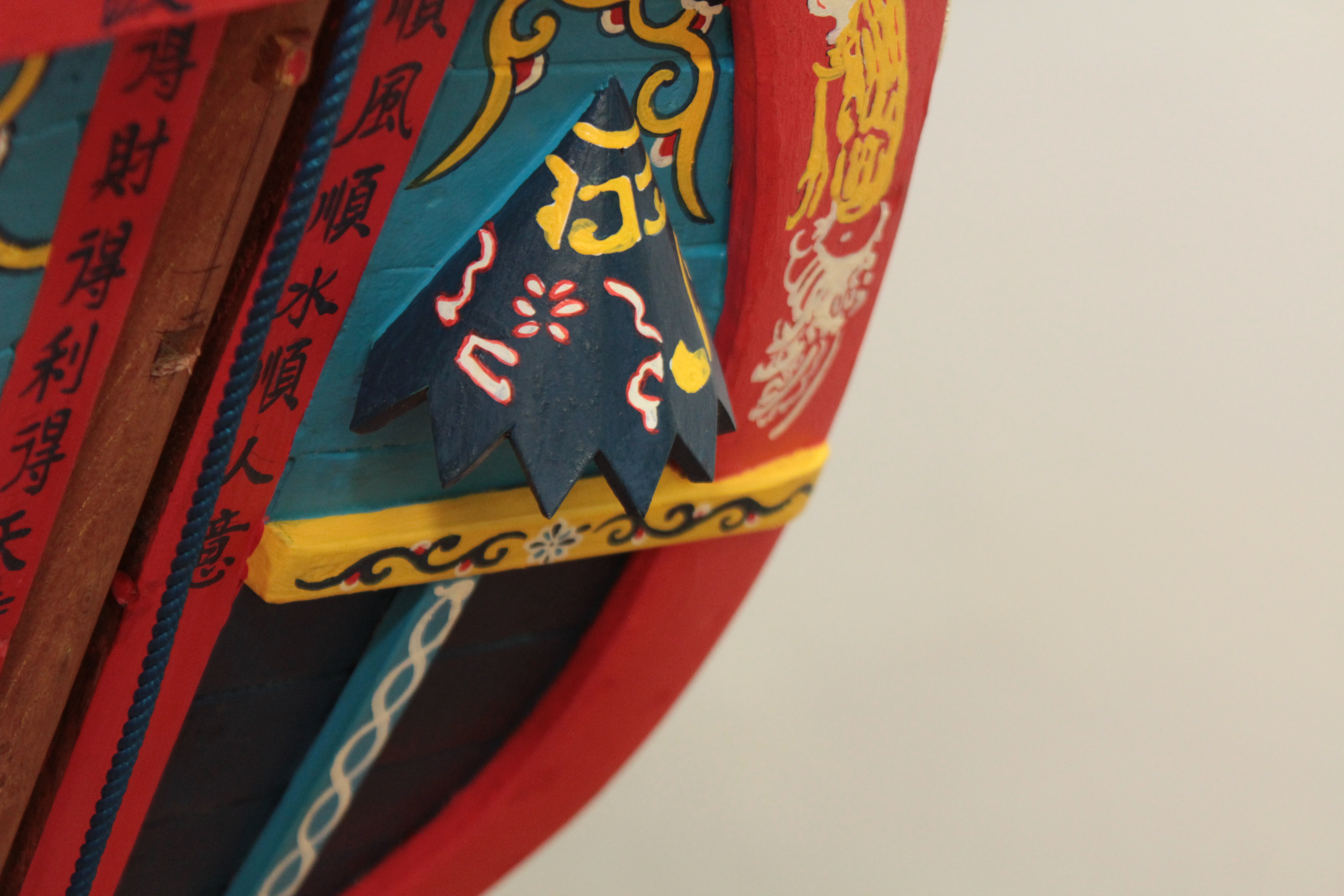 自由中國號模型所使用的主帆及副帆,皆由東港鎮三年一度迎王祭典,所使用王船的船帆製作師蔡財安先生製作,布料以薯榔染製後,以竹為幹,綁上棉繩製作。