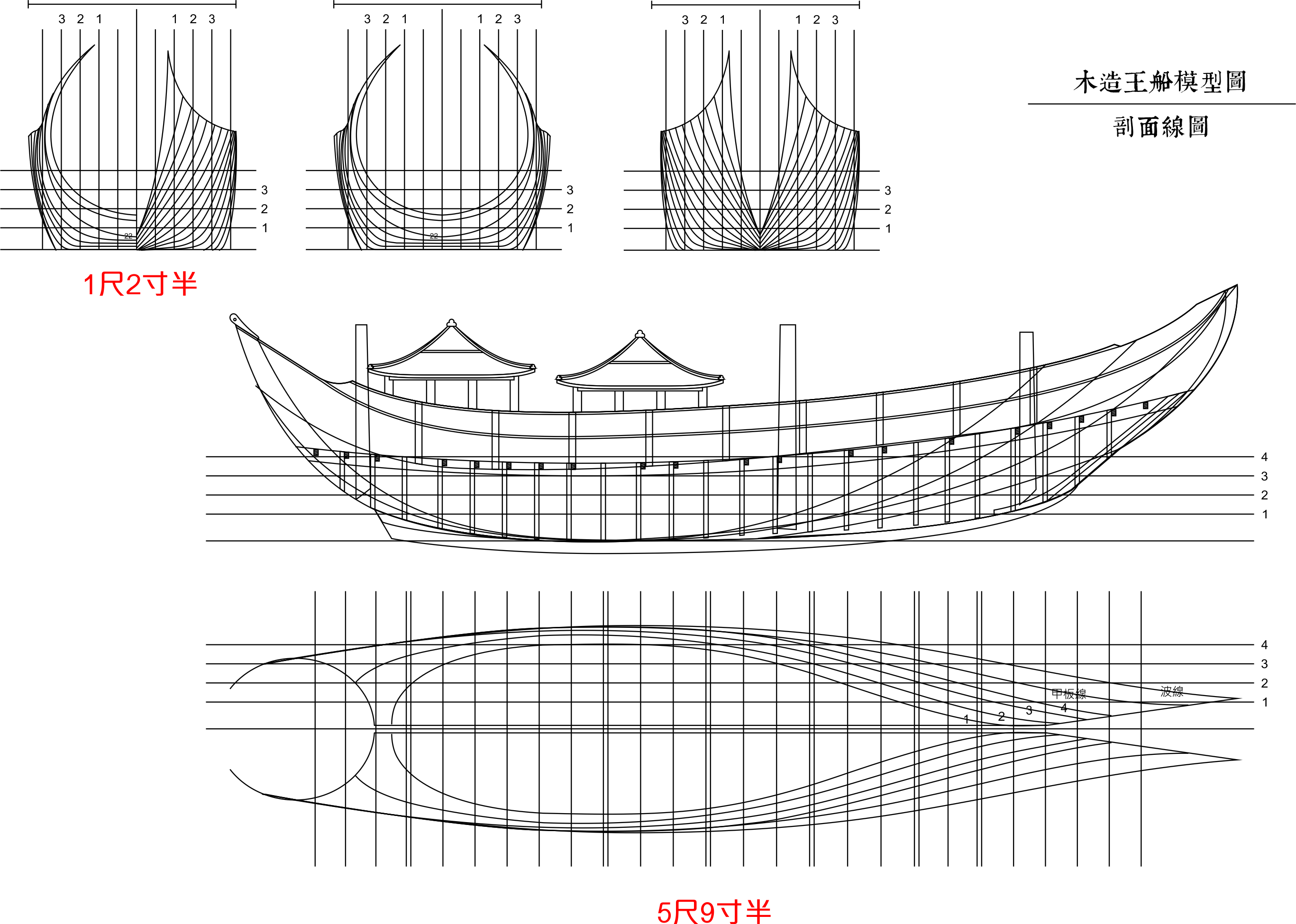 以檜木進行施作,外觀依據中式帆船為基礎進行設計。內部功能與一般海船相似,如「王船 13 艙」, 內容包括頭錠、官廳、尾樓佛祖廳、東西官廳、聖人龕、舵公艙、阿班艙、東 猫筣、灶廚、總舖艙、中艙公費、頭二艙等基本構造,除艙體結構外,王船上 須配有船桅、帆、舵、槳、錨、繩、接駁小艇 2 艘等,製作時須先繪制各方位船圖。